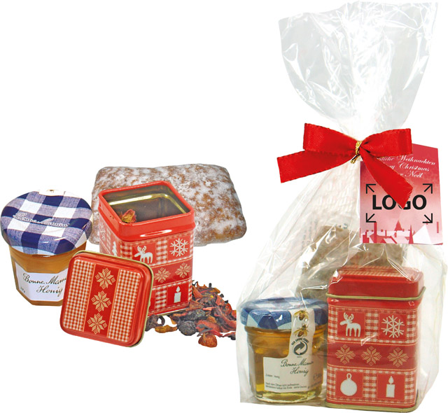 Beschreibung: Dieses Präsente-Set enthält alles für gemütliche und behagliche Stunden in der Winterzeit und zu Weihnachten. Praktisch zum Überreichen wurde alles hübsch verpackt in der Klarsichttüte. Daher sieht man schon von außen die schöne kleine rote Dose mit dem Weihnachtsfrüchte-Tee, die Elisenschnitte sowie den Honig im Gläschen. Platz für den Werbedruck ist auf dem Standardmotiv des Anhängekärtchens oder eine eigene Gestaltung, jeweils bereits ab 100 Stück.