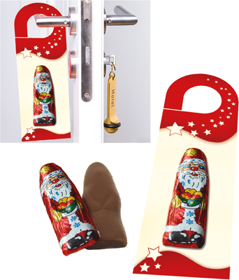 Beschreibung: Eine kleine süße weihnachtliche Überraschung für Ihre Gäste. Mit diesem Schokoladen-Weihnachtsmann zaubern Sie mit Sicherheit ein Lächeln auf das Gesicht Ihrer Gäste, wenn diese die süße Überraschung an ihrer Tür vorfinden. Platz für den Werbedruck ist auf dem Standardmotiv oder eine eigene Gestaltung des Türanhängers, jeweils bereits ab 250 Stück.