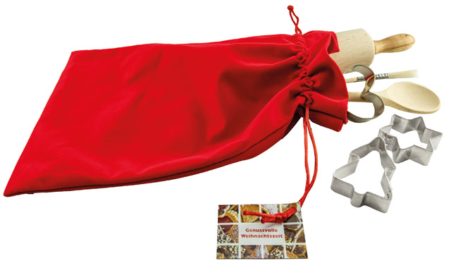 Beschreibung: Das Backen zur Weihnachtszeit hat in vielen Familien Tradition. Besonders die Kinder freuen sich über dieses handliche Backset, dass alle Utensilien für die Plätzchenbäckerei bereithält: Teigrolle, Backpinsel, Rührlöffel, 3 Ausstechformen (Herz, Stern, Tannenbaum) und ein Grußkärtchen mit Rezept. Alles ist in einem schönen roten Samtsäckchen verpackt. Platz für den Werbeeindruck ist auf dem Standardmotiv des Anhängekärtchens oder eine eigene Gestaltung des Kärtchens, jeweils ab 100 Stück.
