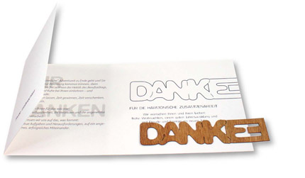 Beschreibung: Mit dieser Weihnachtskarte können sie ganz einfach "Danke", z. B. für die harmonische Zusammenarbeit, sagen. Das Holzlesezeichen kann nachhaltig genutzt werden und ist so immer wieder präsent. Eigene Schriftzüge sind nach Vorlage ab 250 Stück möglich. Platz für den Werbedruck ist auf dem Standardmotiv der Karte oder eine eigene Gestaltung, jeweils ab 100 Stück. Ein Kuvert ist separat erhältlich, Artikel 6101