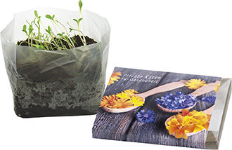 Description: The edible flowers cornflower, marigold and tagetes tenuifolia are a feast for the eyes and the palate. They can be a coloured decoration and at the same time an extraordinary taste experience. You may use the slipcase for your advertising. A full colour personalisation starts with 250 pieces.