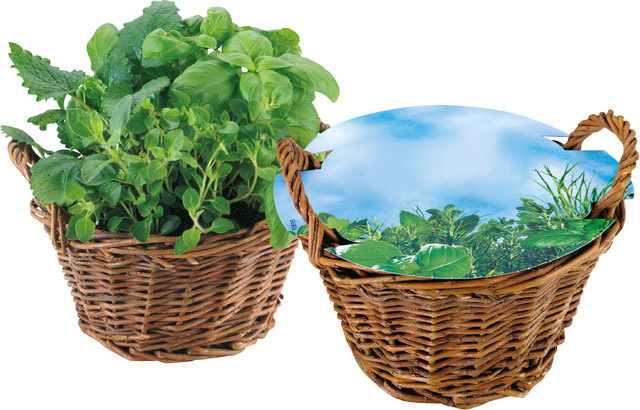 Description: The wicker basket with handles contains flower soil, planting instructions and seeds. Advertising is possible on the standard design of the cover. Your personaisation of the cover starts with 250 pieces.
